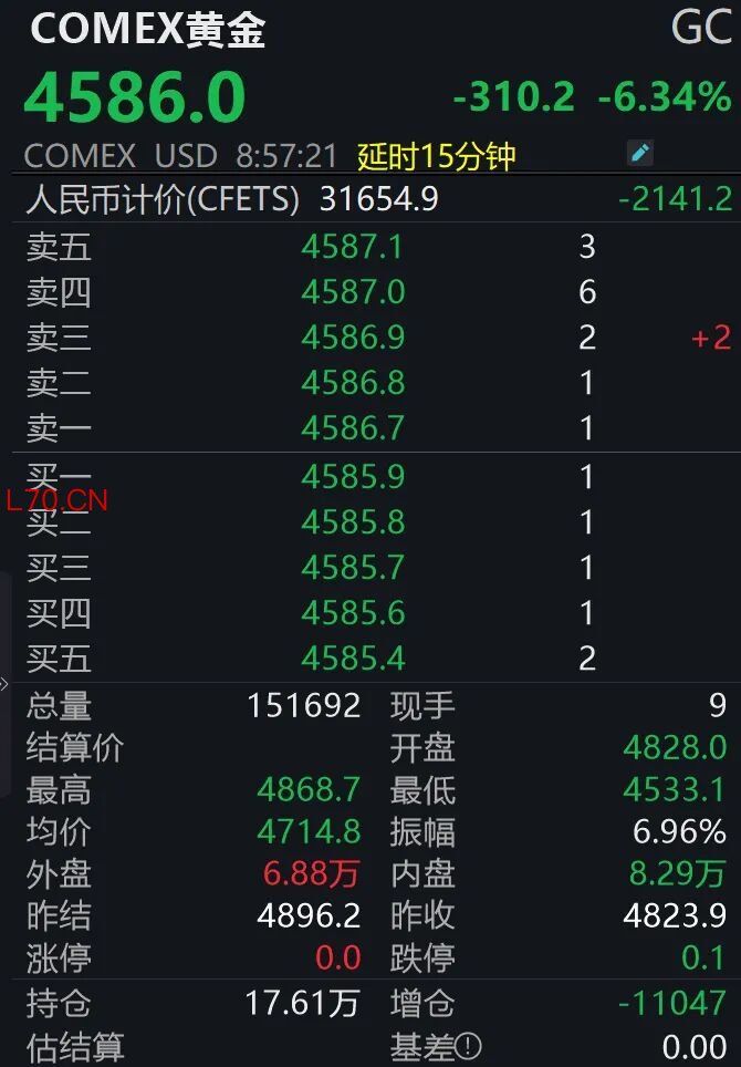 期货市场同步走弱,COMEX黄金期货日内大跌6.34%,报4586美元/盎司,盘中最低下探至4533.1美元/盎司。