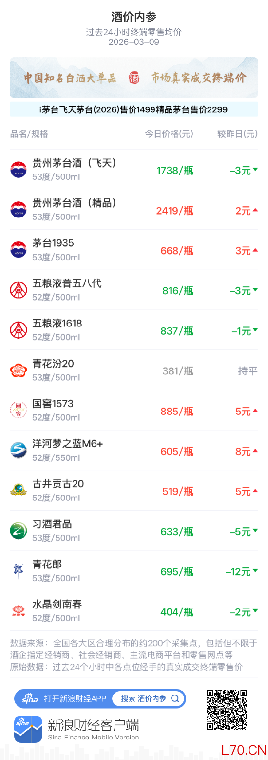 【酒价内参3月9日价格发布 整体价格小幅回落创近五天新低】新浪财经“酒价内参”过去24小时收集的数据显示,中国白酒市场各大单品的终端零售均价在3月9日整体小幅回落。如果主要单品各取一瓶打包售卖,今日总售价为10600元,较昨日下跌3元,为近五天以来新低。市场交投趋于平稳,价格运行重心小幅下移。