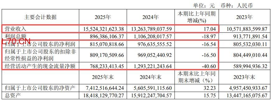 3月19日晚间,新泉股份(SH603179,股价69.53元,市值354.7亿元)披露2025年年报,公司2025年实现营收155.24亿元,同比增长17.04%;实现归母净利润8.15亿元,同比下滑16.54%;实现扣非净利润8.09亿元,同比下滑16.5%;基本每股收益1.66元,同比下滑17%。公司向全体股东每10股派发现金股利3元(含税),剩余未分配利润结转以后年度,以资本公积金转增股本,每10股转增4股,不送红股。