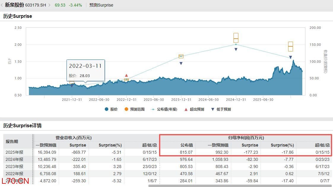 按照年报披露的数据来看,新泉股份2025年出现“增收不增利”的情况。另据Wind金融汇编的数据,15家机构对新泉股份2025年归母净利润的一致预测值为9.923亿元,因此按照公司披露的8.15亿元的数据来看,是不及预期的(-17.86%),且低于所有15家机构给出的预测值。