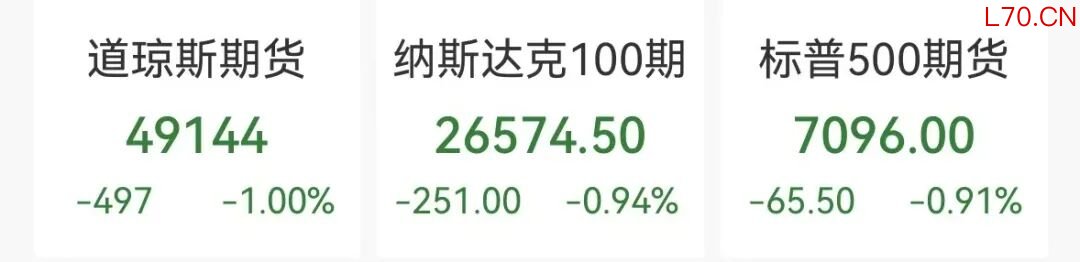 美股三大股指期货集体低开, 截至发稿, 道指期货跌1%,纳指期货、标普500指数期货跌超0.9%。